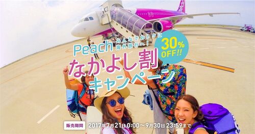 こんばんは^^ 今日はPeachのキャンペーンについてご紹介したいと思います。 Peach、30%OFFになる"なかよし割キャンペーン"開催へ